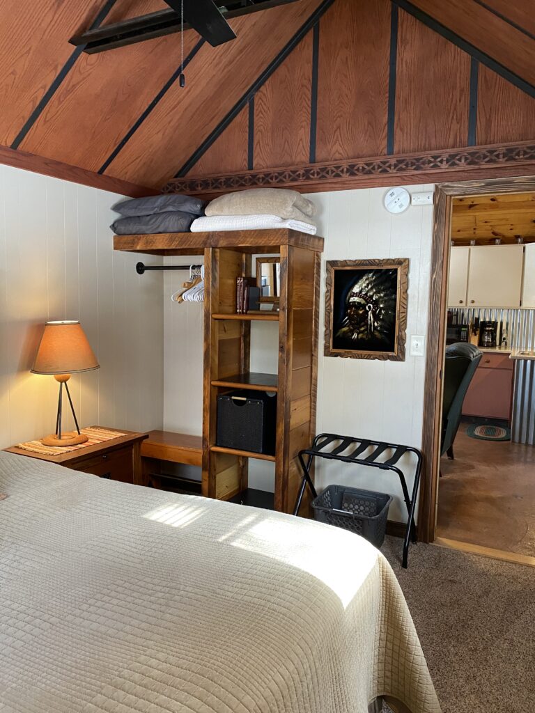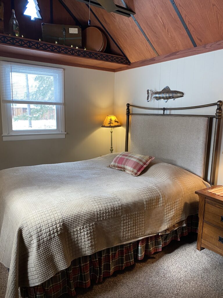 Jack Pine (Cabin #6) is a one bedroom with one queen bed and a full-size fold-out futon in the living area. Bed linens are furnished - please bring your own kitchen and bath towels. (Towels may be provided at an additional charge.) The cabin has a fully equipped kitchen (including a stove, refrigerator/freezer, microwave, coffee maker, toaster, cookware, and utensils). Jack Pine offers a shared dock, patio, campfire ring and is situated about 170 feet from the lake. All of the cabins at the Hideaway include air conditioning, cable tv, and internet. Hideaway Resort guests have access to the game room, sandy beach, playground, firewood, canoes, kayaks, and paddle boats.